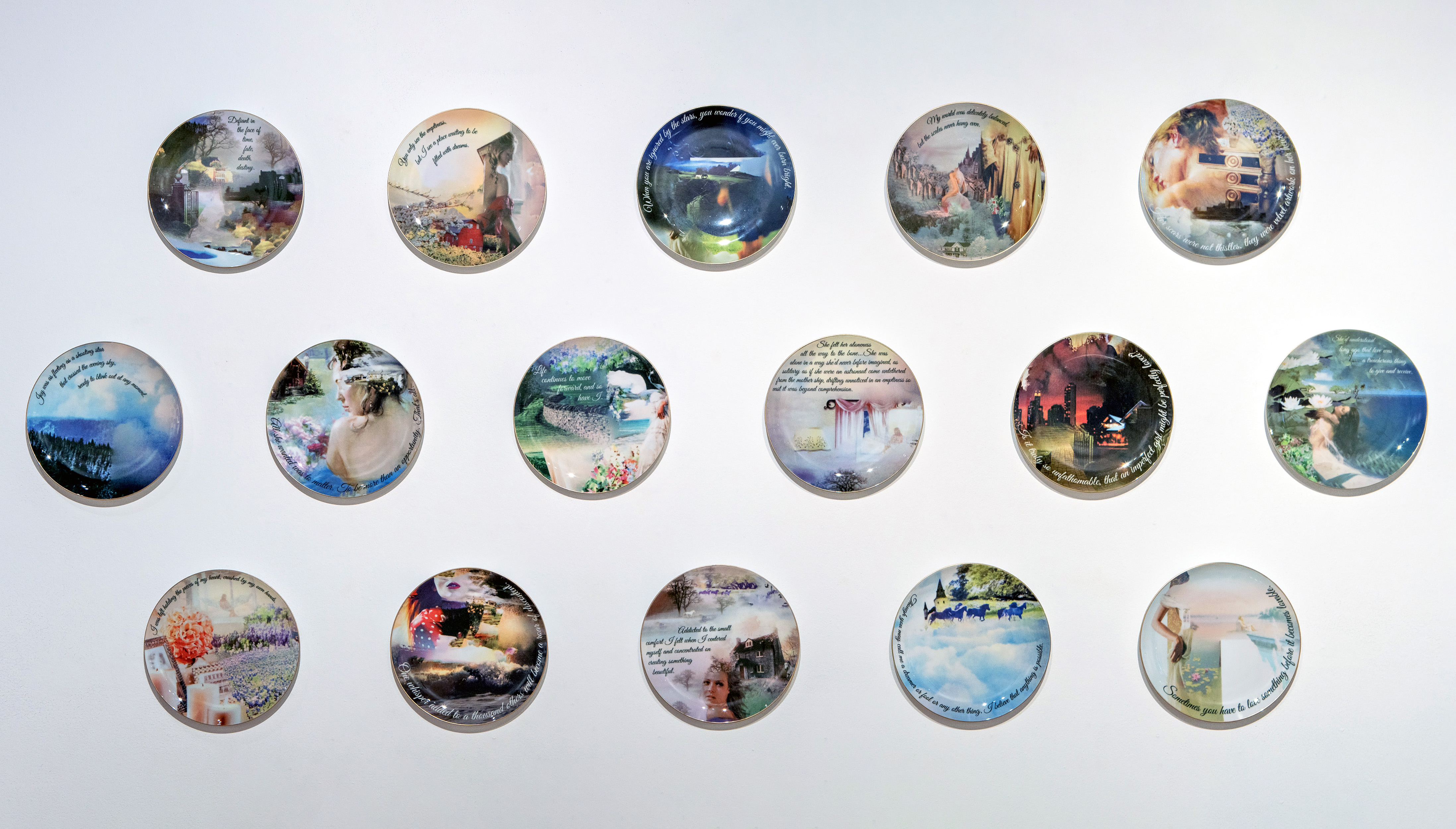 Captured by an Algorithm is a commemorative plate series that looks at romance novels through the lens of the Amazon Kindle Popular Highlight algorithm. A passage in a Kindle e-book becomes a Popular Highlight after a certain number of people independently highlight the same passage. Popular Highlights show up as underlined text along with the number of people who highlighted that passage. These highlighted passages are not the sort of thing that people would broadcast. They aren’t something people are saving to return to later or posting on Goodreads. Not having to perform through a persona allows people to express their empathy and vulnerability. Since 2010, I have collected Kindle Popular Highlights from romance novels into a database. Each commemorative plate features one of these highlights and a landscape generated by running Photoshop’s Photomerge algorithm on scanned romance novel covers.